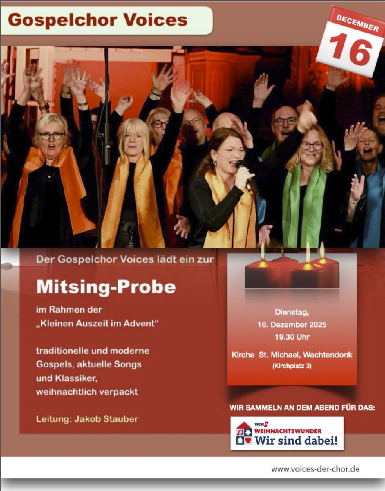 Wer Lust hat, ein wenig Abstand vom Trubel in der Vorweihnachtszeit zu bekommen und sich singend auf das bevorstehende Fest einstimmen möchte, ist herzlich eingeladen, zu unserer Mitsing-Probe zu kommen. Wir freuen uns auf Euch und gerne auch auf Eure Spende, die dem WDR 2 Weihnachtswunder zu Gute kommen wird.